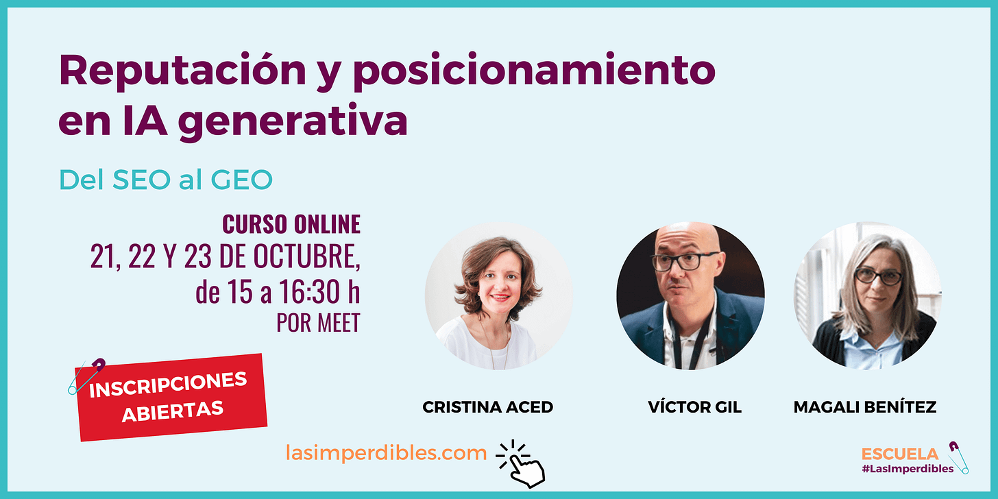 Pues te llevarás muchas más en el curso de 3 días sobre “Reputación y posicionamiento en IA generativa” de la escuela de #LasImperdibles 🧷.